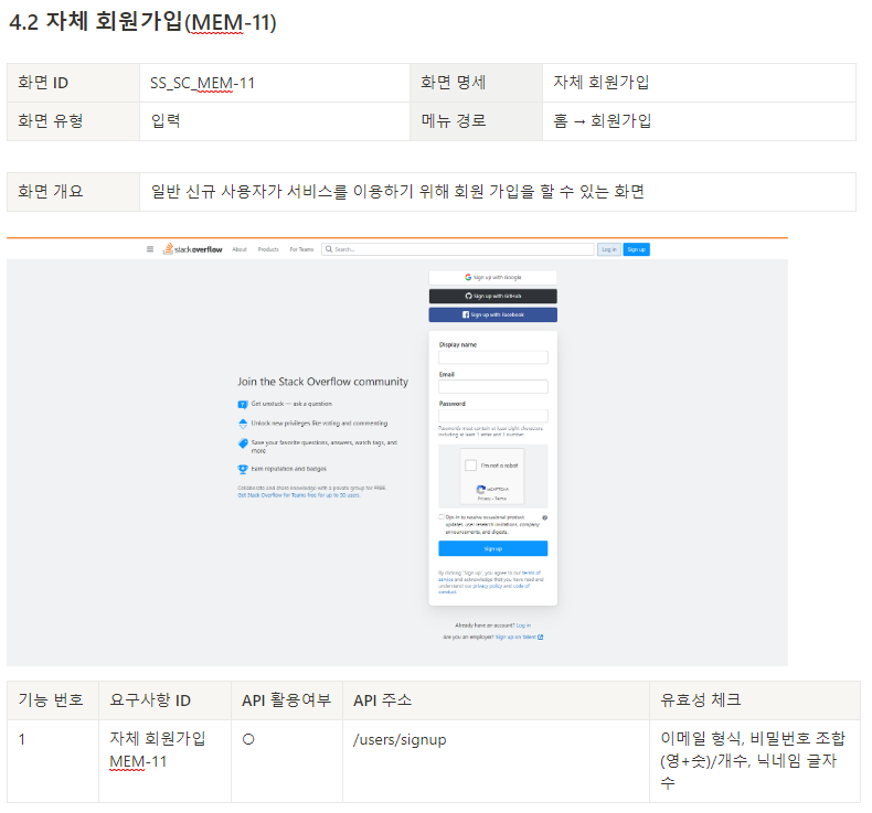 이번 Pre-Project의 주제는 Stack Overflow를 클론코딩 하는 것이라, 비기능적 요구사항은 제외하고 간단히 기능적 요구사항만 기술하였습니다. 양식은 SW인재양성 교육 때 사용한 양식을 노션에 똑같이 만들어서 사용했습니다.