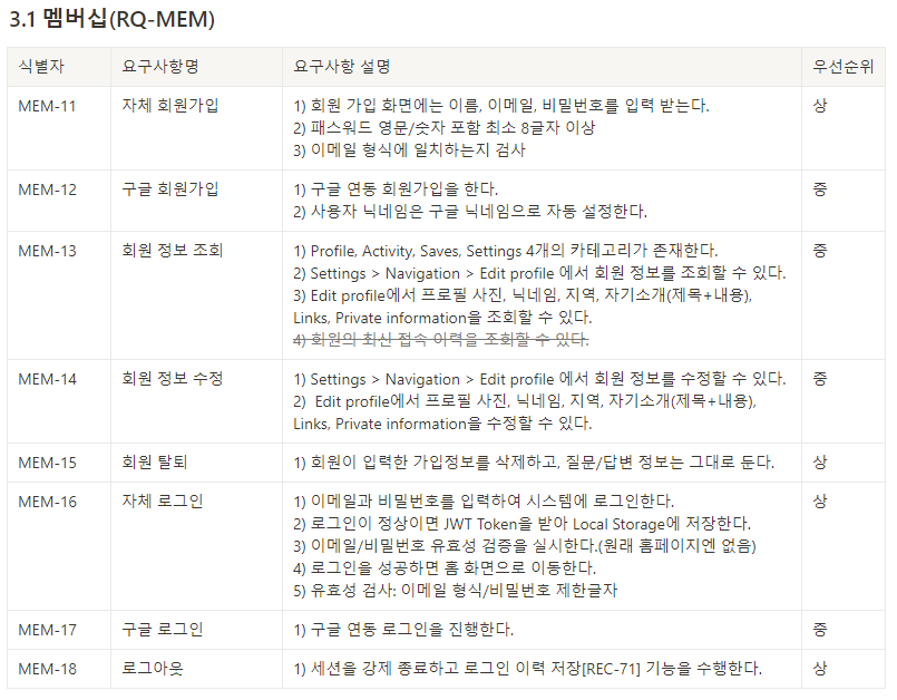 이 과정에서 처음에는 FE+BE 팀원들이 전부 모여 '기능목록' 표를 기반으로 각 요구사항에 대한 상세설명을 그냥 떠오르는 대로 막 적었습니다. 팀장인 제가 타이핑 하고, 팀원들이 함께 대화하며 이것저것 추가하는 식이었죠. 기획 시간이 부족해서 빠르게 해결하려다 보니 어영부영 그랬는데, 그 결과 요구사항에 대한 상세 설명이 너무 부족했습니다.