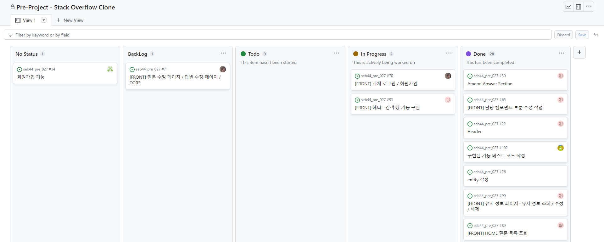 들어가면서... 약 2주 동안의 Pre-Project(스택 오버플로우 클론 코딩)가 무사히 마쳤습니다. 주말 제외, 기획 제외하면 개발 시간은 정말 얼마 안 됐는데, 미완성으로 끝나도 아쉬워하지 말자 다짐