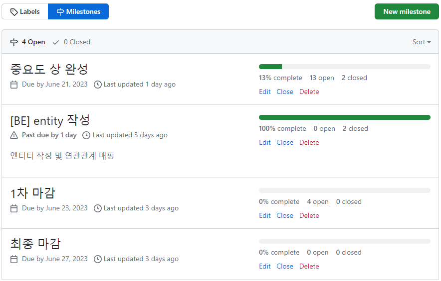 - GitHub Project Kanban을 사용하므로 마일스톤으로 스프린트를 설정합니다.