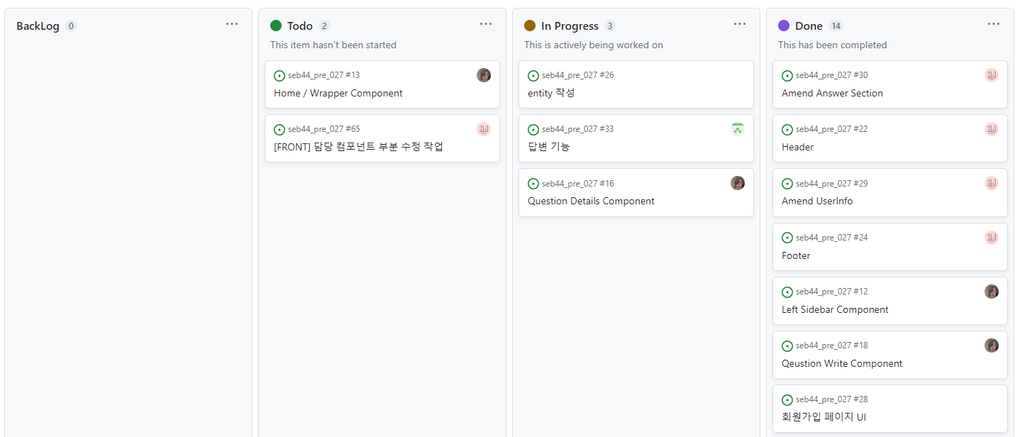 그런데 갈수록 귀찮아져서인지 저를 포함한 팀원들이 Github Projects 관리에 소홀해졌었네요..ㅎㅎ 뒤늦게 Done으로 몇가지 옮겨봤습니다. 회원가입/로그인도 잘 됩니다...