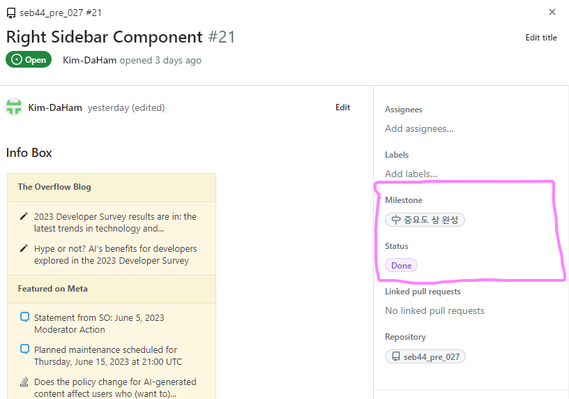 이슈(티켓)에 Milestone 연결하기 분홍색으로 표시한 부분이 현재 스프린트에 해당하는 마일스톤을 연결한 모습입니다.