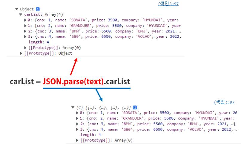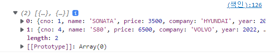 아래 carList를 동적으로 보여준다. <!-- 언더 스코어 사용 --> <script src="https://unpkg.com/underscore@1.13.4/underscore-umd-min.js"></script> <script> const template = `<% carList.forEach(function(car) { %> <tr class="listBoxRow"> <td><%=car.cno %></td> <td><%=car.name %></td> <td><%=car.price %></td> <td><%=car.company %></td> <td><%=car.year %></td> <td> <select class="star"> <option>1</option> <option>2</option> <option selected>3</option> <option>4</option> <option>5</option> </select> </td> <td><button>delete</button></td> </tr> <% }); %>`; let carList = []; myGetList("/list"); function myGetList(url) { let xhr = new XMLHttpRequest(); xhr.onreadystatechange = function(){ if(xhr.status==200 && xhr.readyState==4) { let text = xhr.responseText; carList = JSON.parse(text).carList // JSON 구문 분석 drawTable(carList); } } xhr.open("get", url, true); xhr.send(); }carList = JSON.parse(text).carList data 를 콘솔에 출력하여 확인하면 아래와 같습니다.