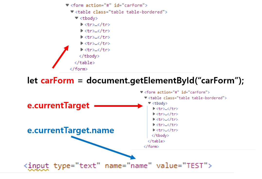 let carForm = document.getElementById("carForm"); carForm.addEventListener("submit", (e)=>{ e.preventDefault(); let name = e.currentTarget.name.value; let price = e.currentTarget.price.value; let company = e.currentTarget.company.value; let year = e.currentTarget.year.value; console.log(name, price, company, year); let xhr = new XMLHttpRequest(); xhr.onreadystatechange = function() { if(xhr.status==200 && xhr.readyState==4) { let text = xhr.responseText; carList = JSON.parse(text).carList drawTable(carList); } } xhr.open('post', "/insert", true); xhr.setRequestHeader("Content-type", "application/x-www-form-urlencoded"); let queryString = `name=${name}&price=${price}&company=${company}&year=${year}`; console.log(queryString); xhr.send(queryString); });xhr.setRequestHeader(헤더이름, 헤더값) - HTTP 요청 헤더의 값을 설정합니다.