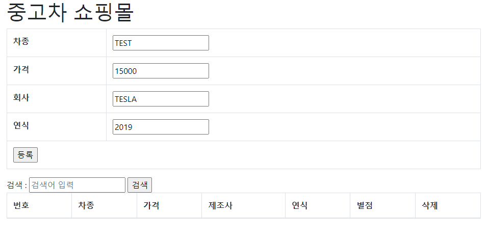 <body class="container"> <h1>중고차 쇼핑몰</h1> <!-- 입력 영역 --> <form action="#" id="carForm"> <table class="table table-bordered"> <!-- bootstrap 사용 --> <tr> <th>차종</th> <td><input type="text" name="name" value="TEST"></td> </tr> <tr> <th>가격</th> <td><input type="text" name="price" value="15000"></td> </tr> <tr> <th>회사</th> <td><input type="text" name="company" value="TESLA"></td> </tr> <tr> <th>연식</th> <td><input type="text" name="year" value="2019"></td> </tr> <tr> <th colspan="2"> <input type="submit" value="등록"> </th> </tr> </table> </form> <!-- 검색 영역 --> 검색 : <input type="text" id="searchInput" placeholder="검색어 입력"> <input type="button" value="검색" id="searchBtn"> <!-- 목록 영역 --> <div id="listBox"> <table class="table table-bordered"> <!--listBox.children[0]--> <thead> <th>번호</th> <th>차종</th> <th>가격</th> <th>제조사</th> <th>연식</th> <th>별점</th> <th>삭제</th> </thead> <tbody id="listBody"></tbody> </table> </div>- <script> 부분