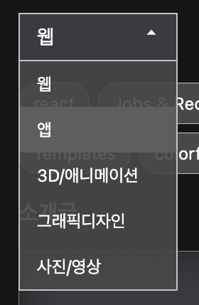 카테고리 Selector UI 생김새는 위와 같습니다. 클릭하면 5개의 포트폴리오 카테고리가 나타납니다.