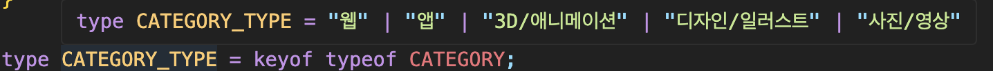 CATEGORY_TYPE 제가 원하던 방식의 문자열 유니온 타입을 보여줍니다!!! 이제 저 CATEGORY_TYPE을 상수 타입으로 여기저기 넣어주기만 하면 됩니다. 먼 훗날 카테고리를 하나 더 늘이게 되더라도 enum 정의만 수정하면 되는 겁니다.