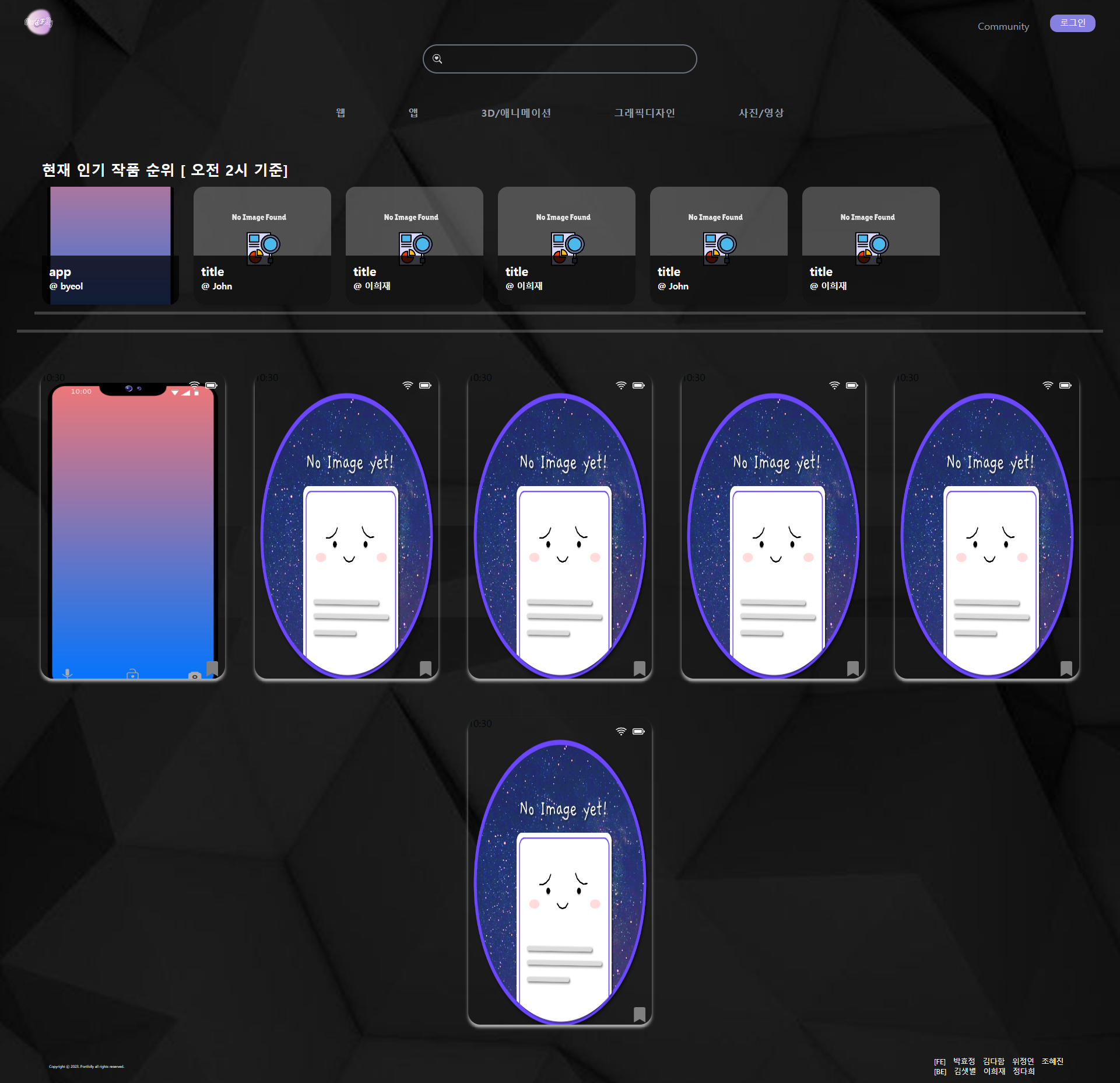 앱/웹/일러스트/사진/비디오 5개 카테고리 별 포트폴리오 목록을 구경할 수 있습니다.