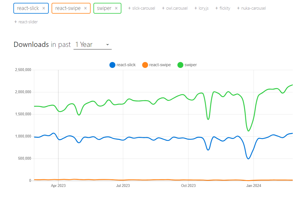 react-slick과 swiper 비교 다운로드 현황 그래프를 보면 swiper가 훨씬 사용률이 높으나, react 외 환경에서도 공급되는 걸 생각하면 비슷한 수요라고 생각됩니다.