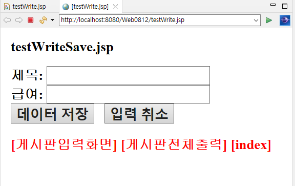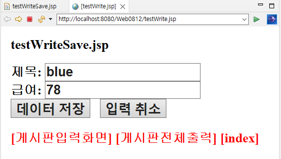 실행 결과 (testWriteSave.jsp) - 데이터 저장 버튼 클릭 시 이동하는 화