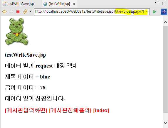 <%@ page language="java" contentType="text/html; charset=UTF-8" pageEncoding="UTF-8"%> <!DOCTYPE html> <html> <head> <meta charset="UTF-8"> <title>[testWriteSave.jsp]</title> <body> <img src="./images/bear.gif"> <h2>testWriteSave.jsp</h2> <% out.println("<h2>데이터 받기 request 내장 객체</h2>"); String Gtitle = request.getParameter("title"); int Gpay = Integer.parseInt(request.getParameter("pay")); out.println("<h2>제목 데이터 = " + Gtitle + "</h2>"); out.println("<h2>급여 데이터 = " + Gpay + "</h2>"); out.println("<h2>데이터 받기 성공입니다.</h2>"); %> <p> <a href="testWrite.jsp">[게시판입력화면]</a> <a href="testList.jsp">[게시판전체출력]</a> <a href="index.jsp">[index]</a> <p><br><br> </body> </html>- request : 데이터 전달