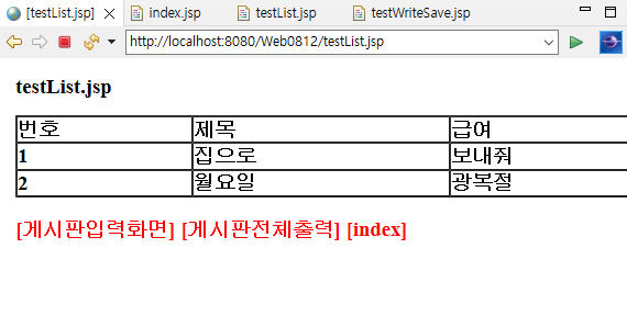 데이터 저장 버튼 클릭 결과 (testList.jsp) - 게시판 전체 출력