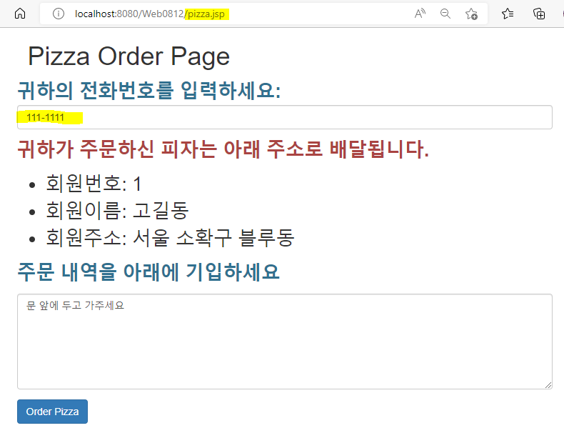 DB에 저장된 전화번호를 입력하면 아래 회원 정보가 자동으로 생겨난다ㅏ. pizzaResult.jsp