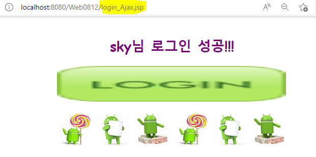 <font size=7 color=purple> <b><%= usera %>님 로그인 성공!!!</b> <br> </font> <img src="images/bt_login.gif" width=450 height=70><p> <img src="./images/lollipop.gif" /> <img src="./images/marshmallow.gif" /> <img src="./images/nougat.gif" /> <img src="./images/lollipop.gif" /> <img src="./images/marshmallow.gif" /> <img src="./images/nougat.gif" />로그인 성공 시 나타나는 글자와 이미지.