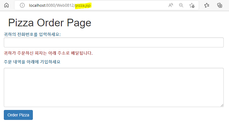 <body> <div class="section"> <div class="container"> <h1>Pizza Order Page</h1> <form role="form" class="form-horizontal" name="orderF" id="orderF" method="POST"> <div class="form-group"> <p class="text-info"> <b>귀하의 전화번호를 입력하세요:</b> <input type="text" size="20" name="phone" id="phone" onchange="getUserInfo()" class="form-control"/> </p> <p class="text-danger"> <b> 귀하가 주문하신 피자는 아래 주소로 배달됩니다. </b> </p> <div id="userInfo"></div> <div id="address"></div> <!-- 비회원 입력 폼 : 비회원일 경우 주소입력 폼을 보여줌 --> <div id="nonUser" style="display:none;"> 주소: <input type="text" name="addr" id="addr" size="60" style="border:2px solid maroon;" class="form-control"/> </div> <p class="text-info"> <b>주문 내역을 아래에 기입하세요</b></p> <p> <textarea name="orderList" id="orderList" rows="6" cols="50" class="form-control"></textarea> </p> <p> <input type="submit" value="Order Pizza" class="btn btn-primary"/> </p> </div> </form> </div> </div> </body>