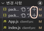 동그라미 친 + 버튼을 클릭하면 두 개의 변경사항이 스테이징 됩니다.