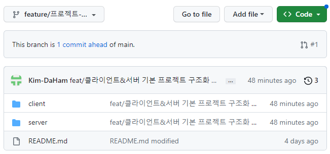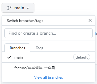 feature/프로젝트-구조화 브랜치에 들어가보면 아까 commit 한 폴더/파일들이 잘 업로드된 걸 볼 수 있는데