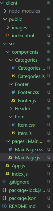 client 폴더 구조 먼저 public 폴더에 필요한 이미지들을 images 폴더를 만들어 넣어두었습니다. public 폴더에 이미지를 넣어두면 이미지를 불러올 때 ./images/blabla.png 라고만 적어도 되어서 간편하다.