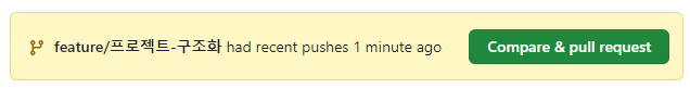 main 브랜치에 feature/프로젝트-구조화 브랜치를 합병해도 괜찮은지에 대한 PR을 작성하는 화면이 나타납니다.