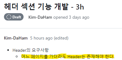 제일 먼저 Header를 만듭니다. 나름 페어 분과 플래닝 포커까지 진행해서 3시간으로 개발 시간을 측정해보았습니다.