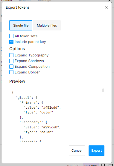 6. 플러그인 왼쪽 하단의 Tools 을 누르고 Export to file/folder을 클릭한 뒤, 토큰을 tokens.json으로 추출한다.