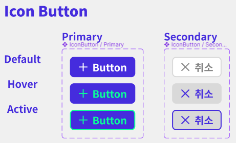 Button 컴포넌트 디자인(Primary/Secondary) 또한 기본 Button 옆에 아이콘이 그려진 Icon Button도 존재한다.