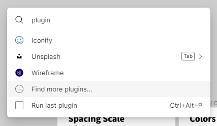 Figma 제목 옆 화살표 클릭 > Duplicate to your drafts 2. 복제한 프로젝트에 접속해 ctrl + P 혹은 command + P를 누른 뒤 plugin을 검색한다. 하단에 있는 Find more plugins...를 선택한다.