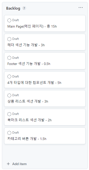 - Backlog : 프로젝트 기능 분석에 따라 도출된 이슈(카드)들. 프로젝트에 필요한 모든 기능