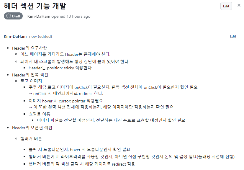 위 화면과 같이 Github Projects를 사용하여 구체적으로 뽑아낸 요구사항을 정리합니다. 이를 통해 작업 기간 동안 모든 요구사항을 올바르게 놓치지 않고 구현할 수 있으며, 다른 개발자가 나의 작업 내용을 확인하며 검토할 수 있습니다.